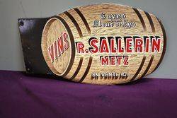 A Lovely Double Sided R. Sallerin Wine Enamel Sign Depicting a Wine Barrel.Lovely Condition, 55cm wide x 33cm high.