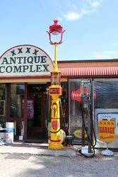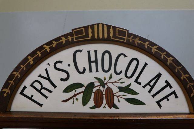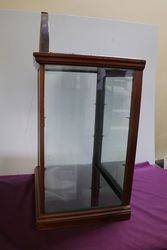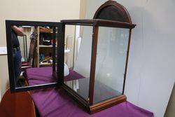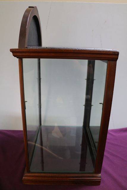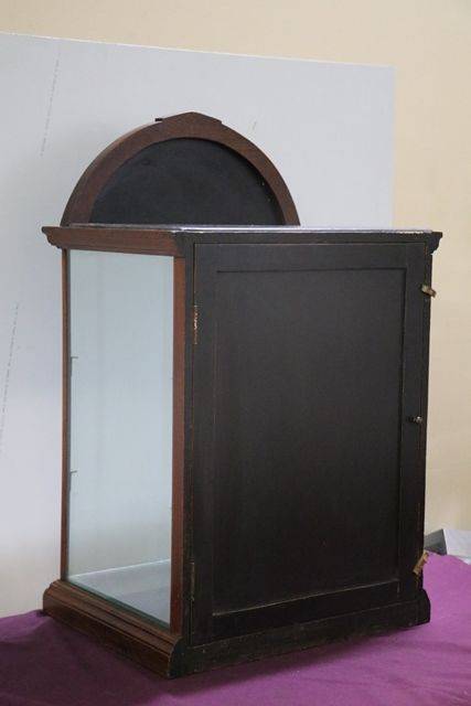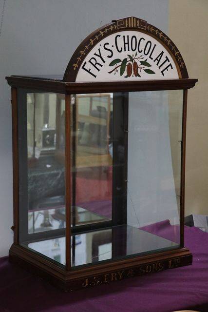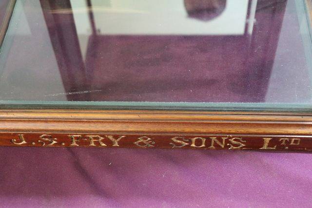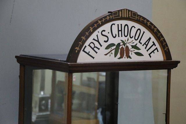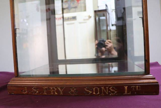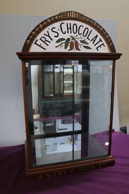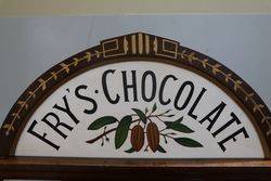 A Early Fry's Chocolate Counter Top Dispensing Cabinet of Small Proportions, Has a aftermarket replacement top pediment..