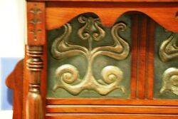 Art Nouveau 6 Panel Bevel Glass Carved Walnut Over Mantle Mirror Unusual with the 3 Pressed Metal Art Nouveau Tiles and the Carved Swan Neck Pediment.