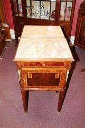 ID: ANT1476Pair of Late C19th French Marble Top Bedside Cabinets. Inlaid and with Gilt Mounts, unusual to have one with a open front.