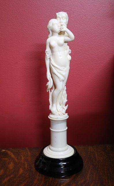Stunning C19th Carved Ivory Figure. The Nymph & Satyr Carousing. This Beautiful and Intricately Carved Example is 33cm in Total Height. Has had a professional repair to the small finger of the Nymph which is Hardly Discernible.