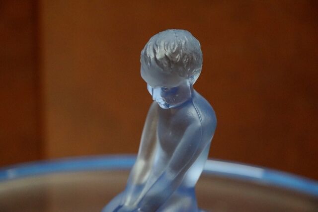Art Deco 3-Piece frosted blue glass Schweig, Mueller Boy on Fish figure with integral frog on glass leaf design Float Bowl with in-curved rim, with stand. Bowl has 1 or 2 bubbles only, figure/frog has no flaws, tiny chip to rim of base of stand. Maker of bowl unknown. C1930's.