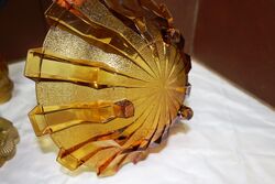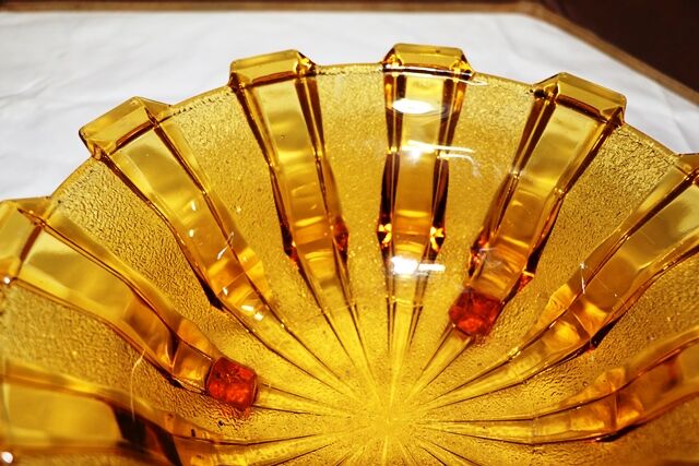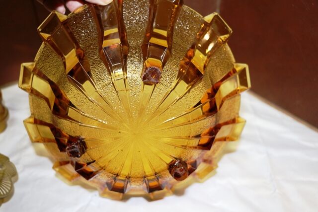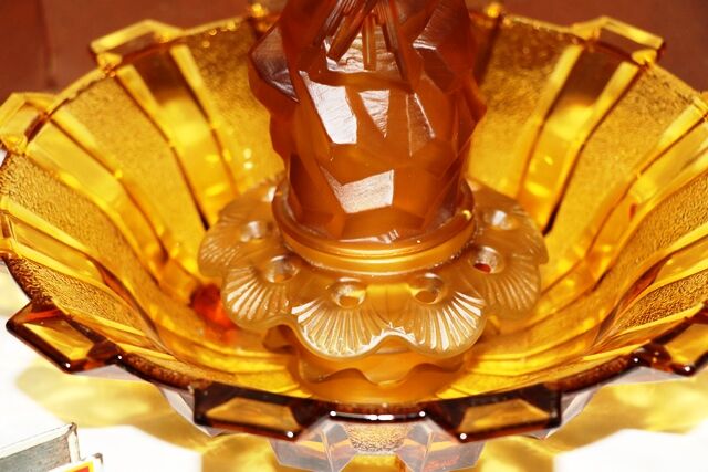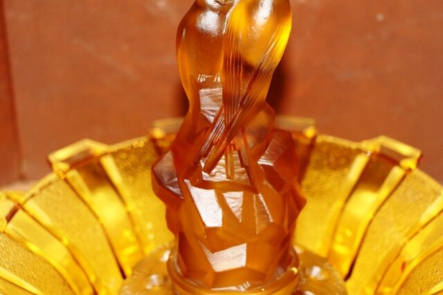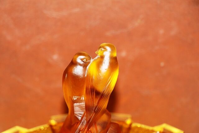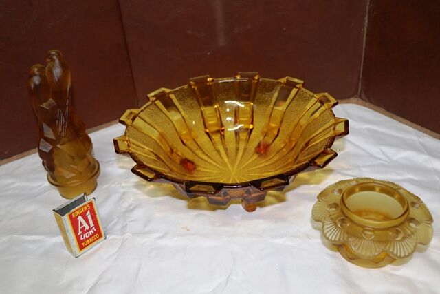 Art Deco 3-Piece frosted amber glass Float Bowl set. Walther & Sohne Schwalben 'Swallows' figure and frog featured in 1936 catalogue. Float Bowl with a Castellated Design. Swallows figure- 1 tiny chip on rim of base. Maker of bowl unknown.