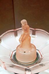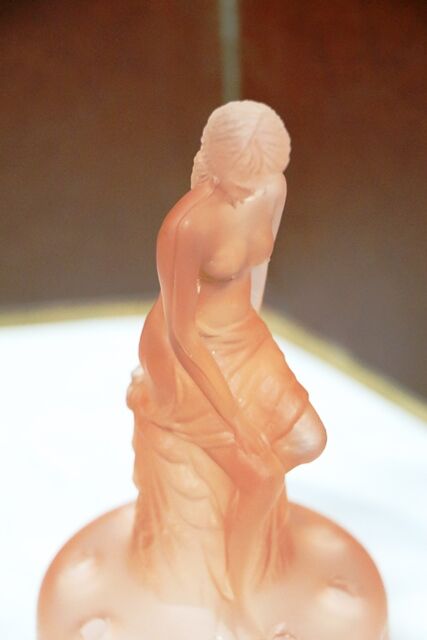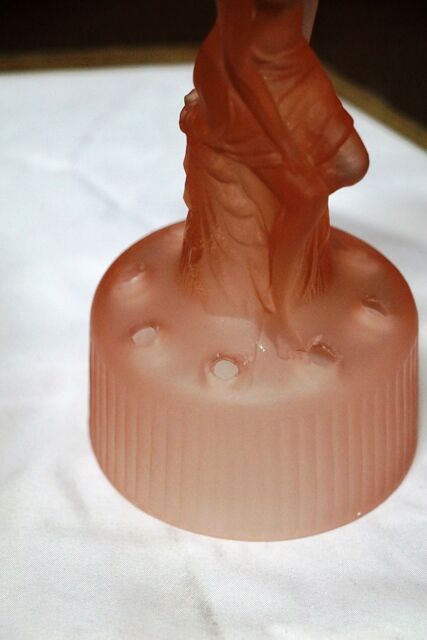 Vintage Frosted Glass Miniature Female Figure on Stand. Designed for miniature candles.Tiny chips around hole on top of column that the figure leans against, some tiny flakes around rim of stand.