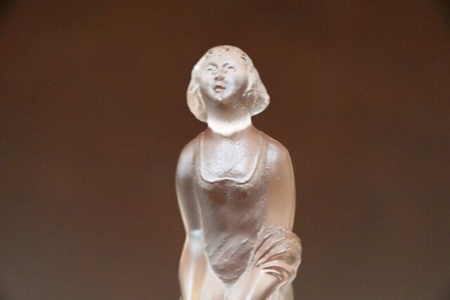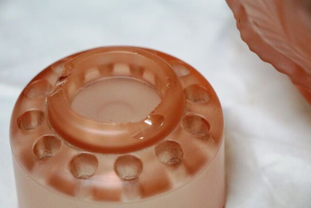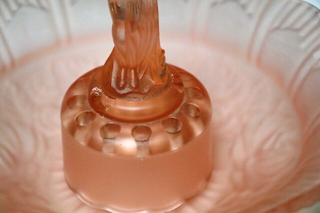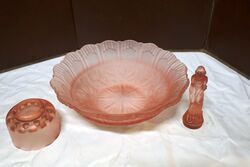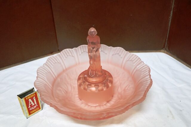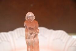 Art Deco 3-Piece Schweig, Muller & Co frosted pink glass 'Cherubs' Centrepiece Bowl and Stand set on decorative black glass plinth. The bowl has a small chips to the base of the foot. but otherwise the set has only normal manufacturing fla