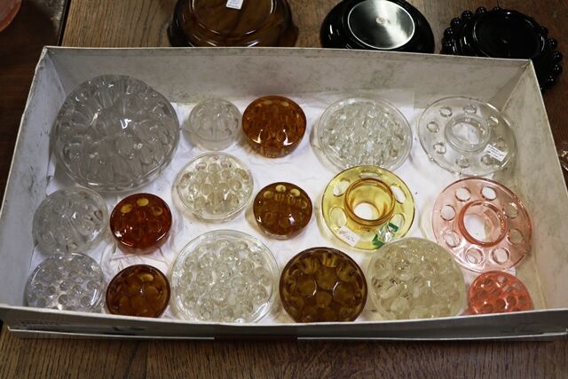 ID: GL1638Art Deco 3-Piece frosted pink glass "Stump Lady" Centrepiece Bowl set. Bowl has fleabites to rim of foot. Baize-lined stand. C1930.
