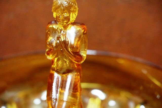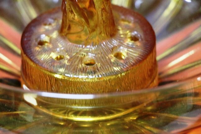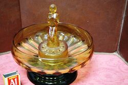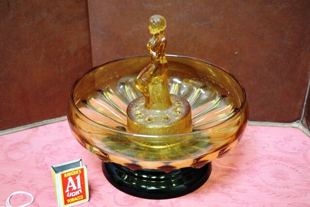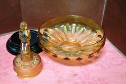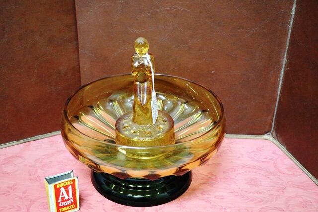 Art Deco Pink Jobling Fire Cone Glass Bowl with a Sowerby Frosted Stump Lady Figure (Frog). On a black glass stand