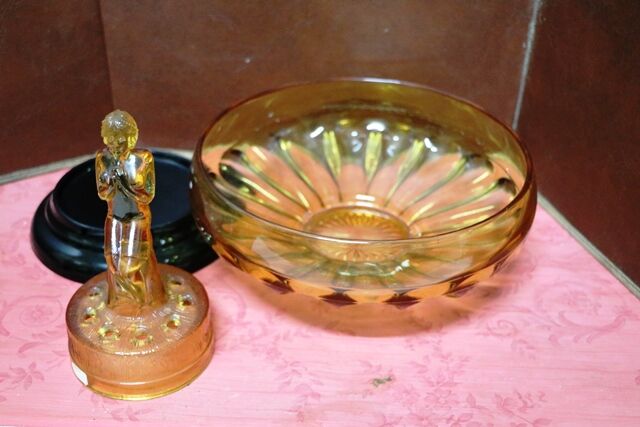 Art Deco 3-Piece frosted pink glass "Stump Lady" Centrepiece Bowl set. Bowl has fleabites to rim of foot. Baize-lined stand. C1930.