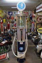 EMMCO Z6 Manual Petrol Pump Restored in Original Neptune Livery ( see PP453 ) Still Retains its Original Blue Glass 6 gallon Cylinder and comes with a Aftermarket Glass Neptune Illuminated Advertising Globe. 3m tall