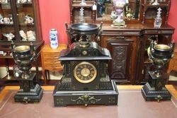 A large imposing and fine quality black slate French 8-day clock set, circa 1870. Shaped Urn mounted top with medallion and molded cornice, over case with brass mounts housing 8 day time and strike movement on base with mask head mounts with 2 extremely