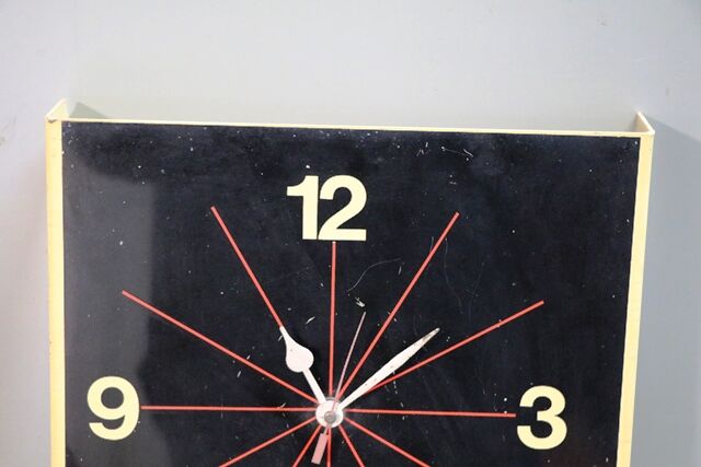 Art Deco Vedette Wall Clock Double Sided Enamel Sign,. Mounted in original Art Deco wrought iron frame bracket. 64cm x 70cm.