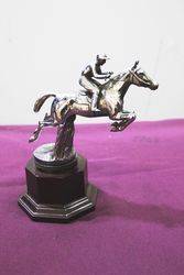 ID: A1688A Desmo Chrome Plated Mascot in the Form of a leaping Horse with Jockey Mounted on a Display Base. 18cm high