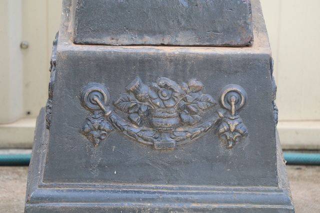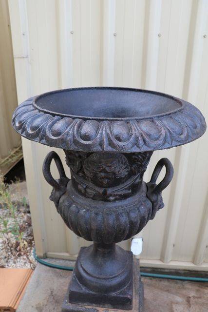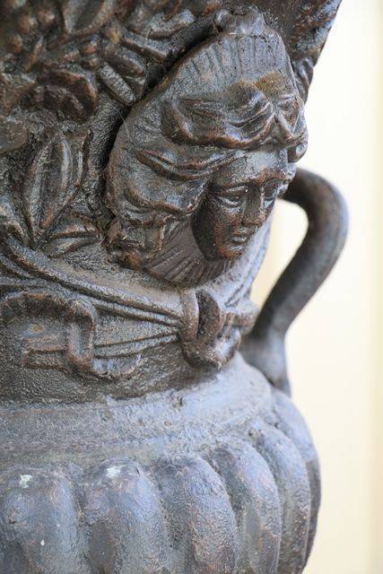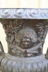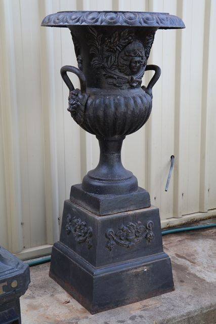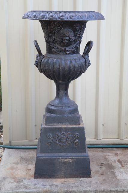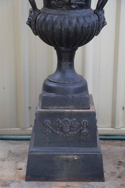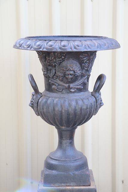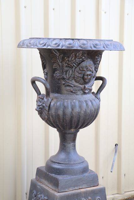 ID: CI94 NLarge Cast Iron Romano Urn on Lion Head Base. 70cm x 155cm high,, weight 180 kgs.