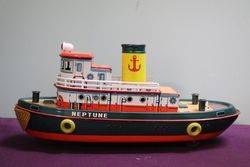 Modern Toys Japanese Tug Boat Neptune Tin Plate Toy, Working Light , Whistle , Engine Noise , Rotating Wheel , Hub , Cabin Rocks Side to Side, Small Paint Chip On Cabin,