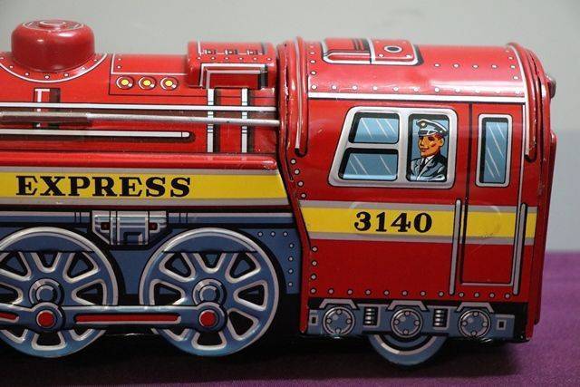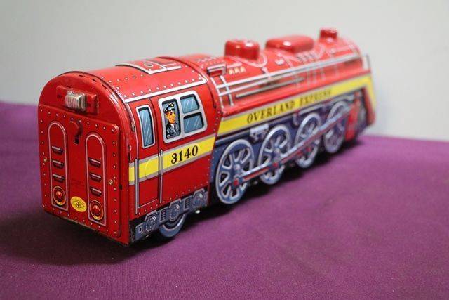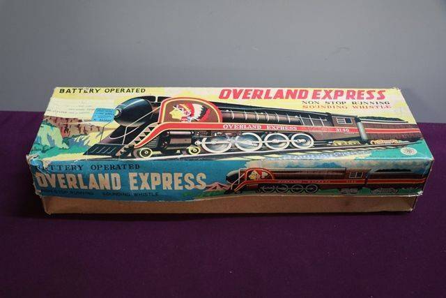 1960's Battery Operated Modern Toys Overland Express 3140 Train Engine, Made In Japan. In Working Order, Engine Noise and Whistle, Train in Original Condition, Box Slight Scuffing Biro Mark on Top. 39 cm long.
