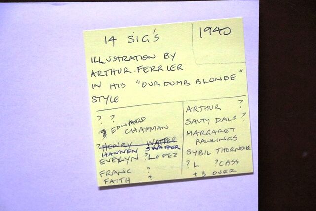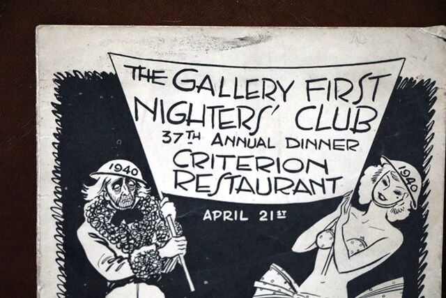 1940 Gallery First Nighters Club Signed Menu. " Dame Sybil Thorndike " Illustration by Arthur Ferrier in his Our Dumb Blonde Style.