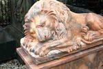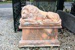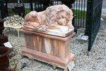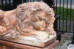 Wonderful Pair of Large Tiger Eye Marble Sleeping Lions on Matching Stands. 120cm long x 120cm high x 44cm wide. Weight 1400kgs.