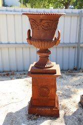 Cast Iron Sonte Prima urn and base. This Sonte Prima is a very pretty garden feature. Color Natural rust.. 60cm dia 80cm high. 63.5kgs.