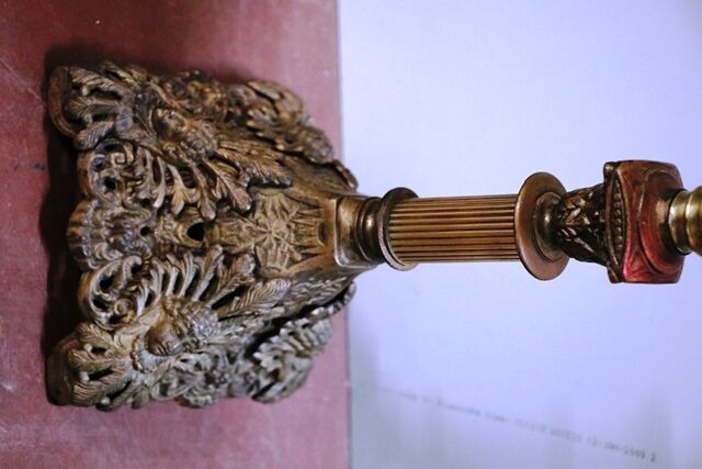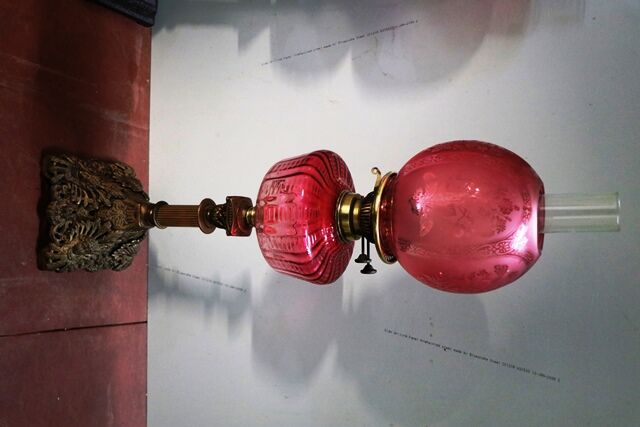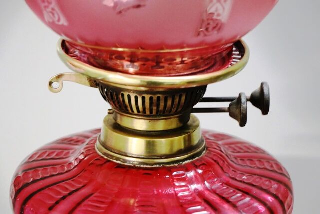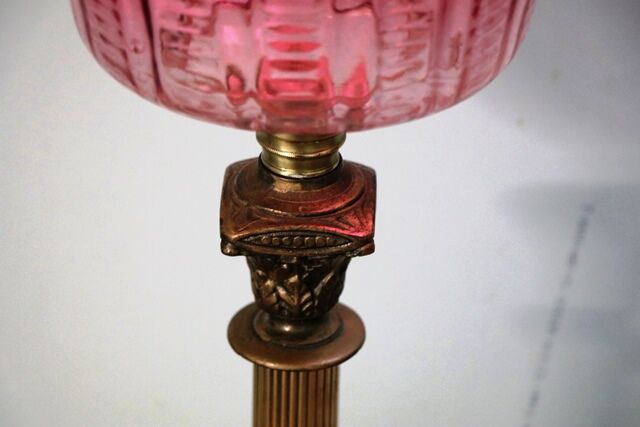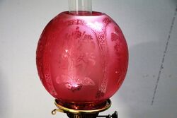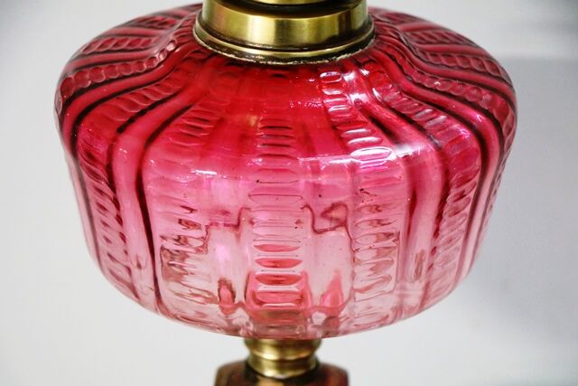 Antique Victorian Double Burner Ruby Banquet Lamp with Gilt Cast Spelter Mounts on Alabaster Base & Column. 88cm high.