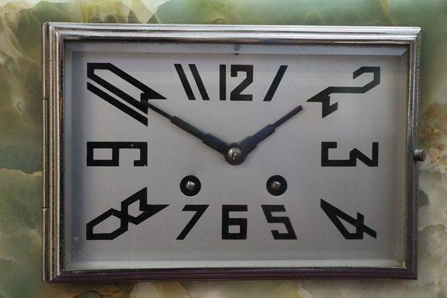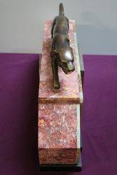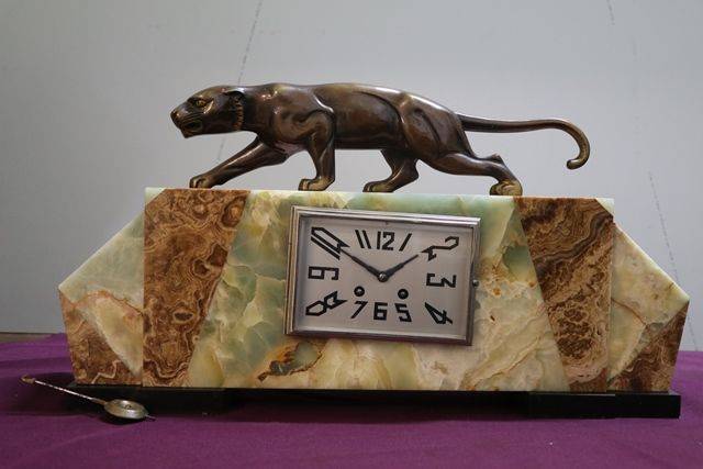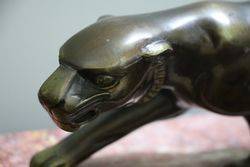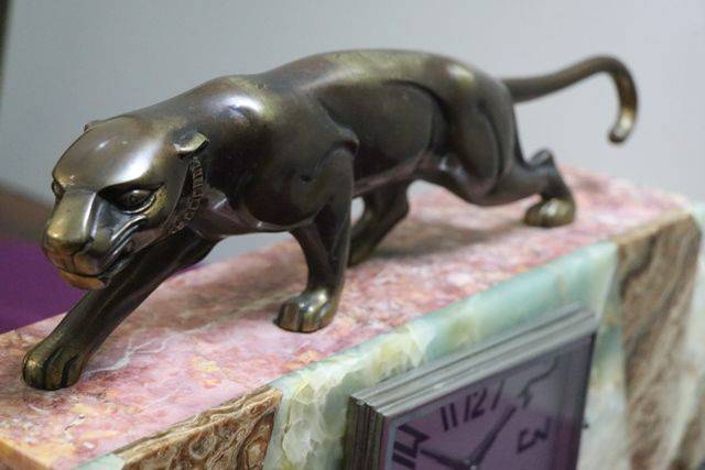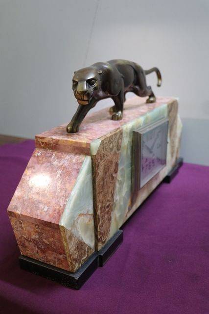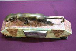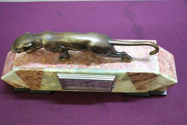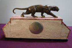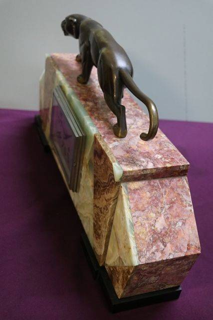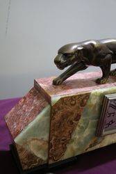 A Lovely Example of a Art Deco Multi Color Marble Mantle Clock Mounted with a Bronze Panther Possibly by Rochard.