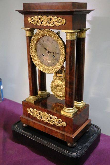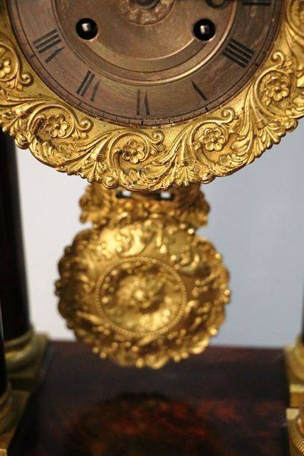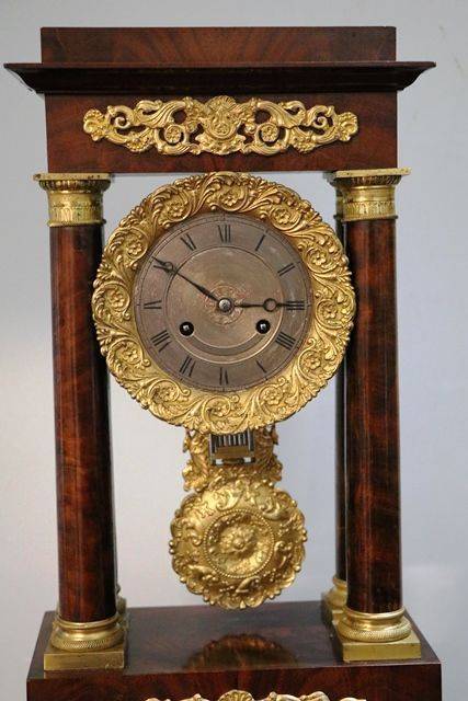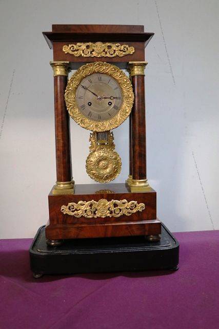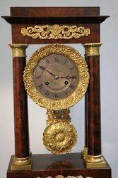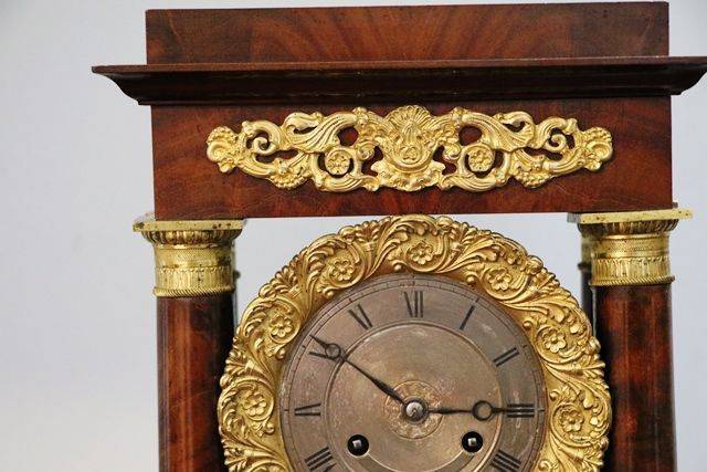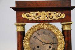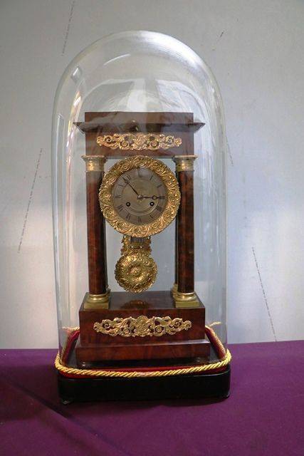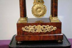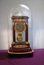 Antique Mahogany French Empire Neoclassical Portico Clock with Ormolu Bronze Mounts,, 8 Day Movement Half Hour Chime.. Rare with the Original Glass Dome.