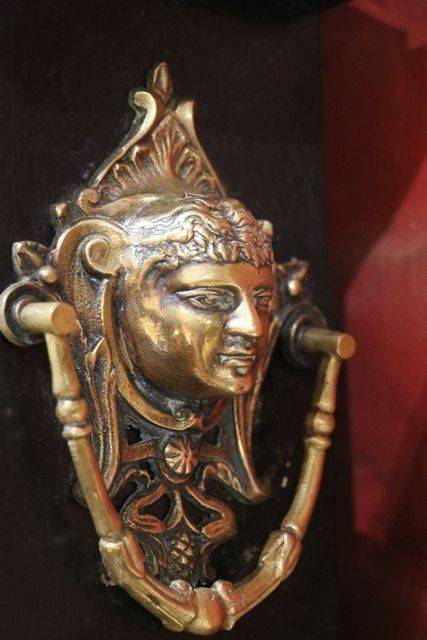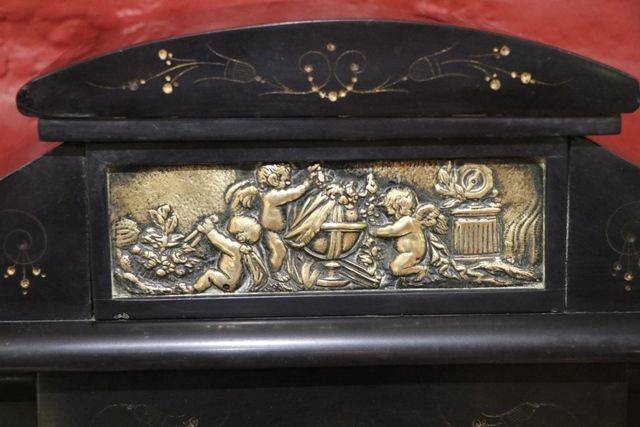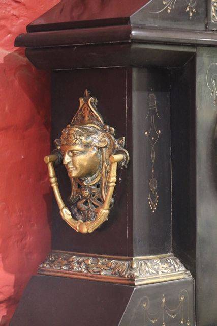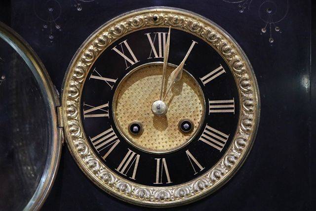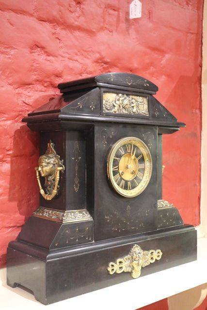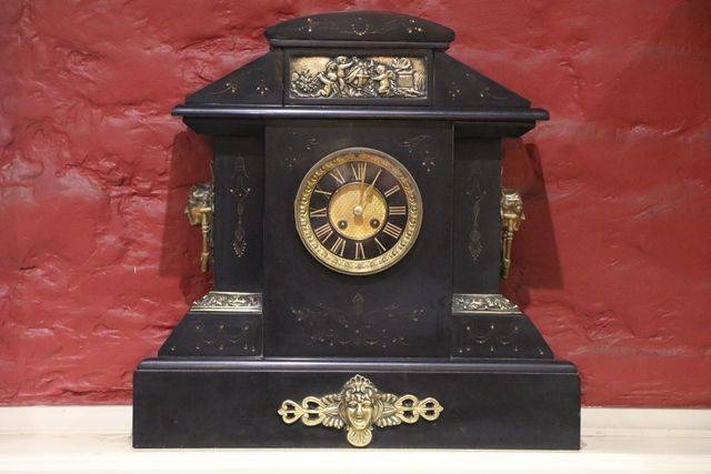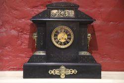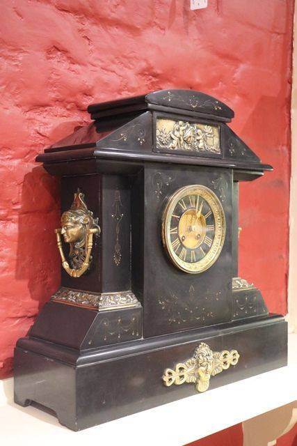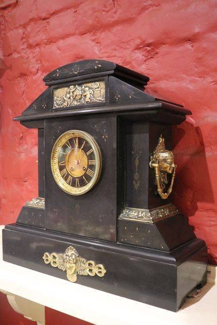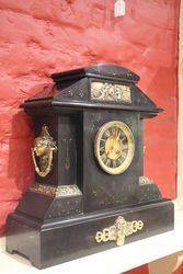 Large Antique Black Marble-Slate Mantle Clock with a French 8 Day Movement Coil Striking Chime. A Chip Repair to Top Corner.
