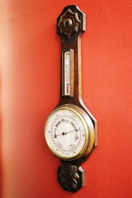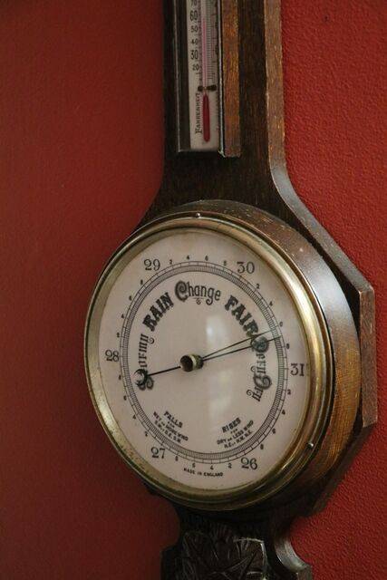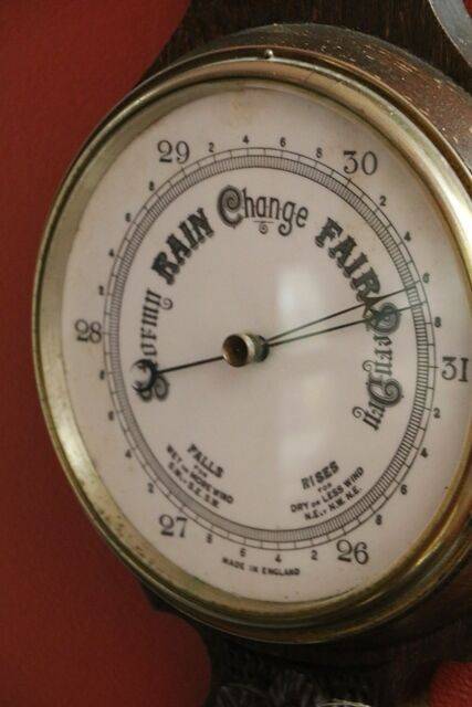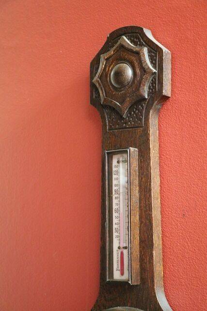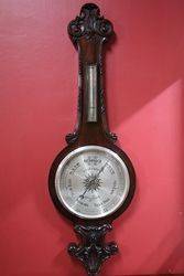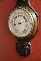 Large Antique Decorative Carved Walnut Aneroid Barometer. From Selfridge of London. 105cm high x 32cm wide.