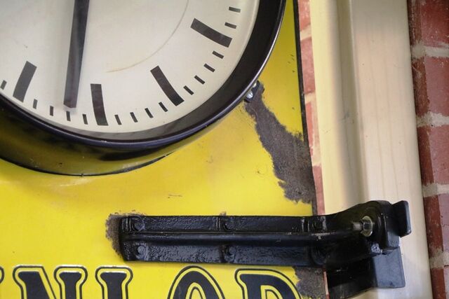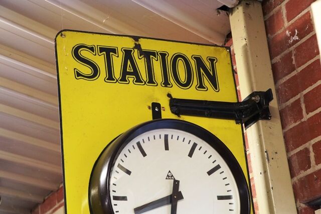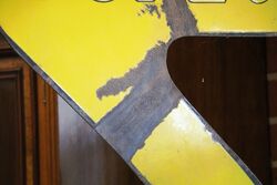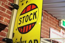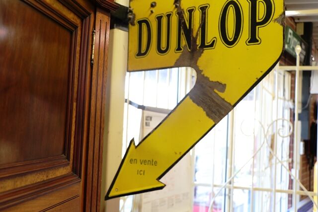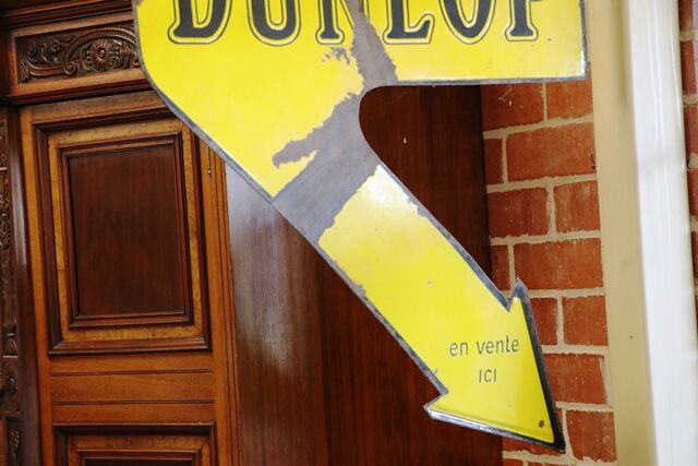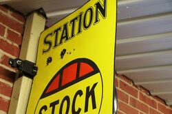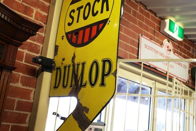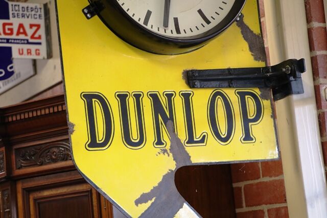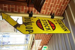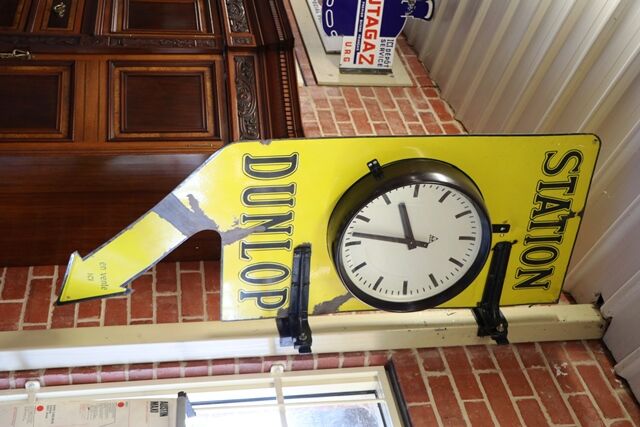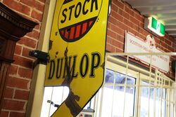 A Very Desirable Dunlop Station-Stock,,, Arrow Double Sided Enamel Advertising Sign, Clock to one Side and Stock Sign to the Reverse. With Cast Iron Mounting Brackets, The clock is a aftermarket battery operated unit modeled on the original. A Fabulous addition to any motoring collection.160cm high x 65cm wide x 11cm.
