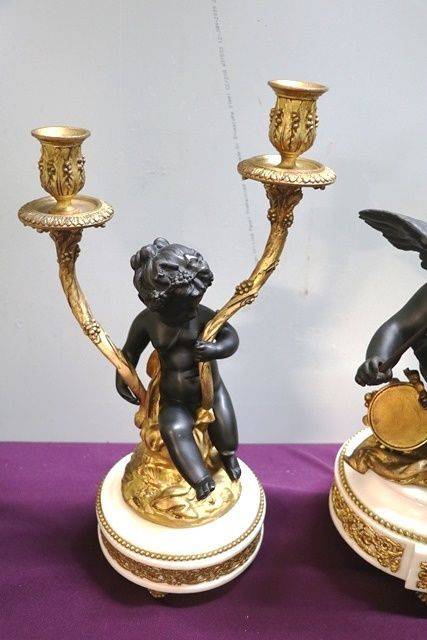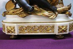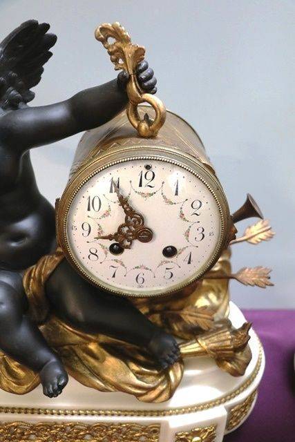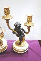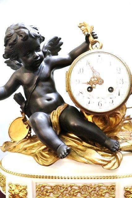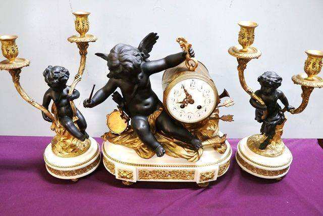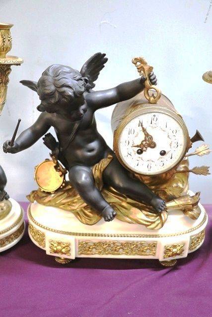 Antique French 3 Piece Spelter + White Marble Cherub Clock Set. 8 day movement on a bell striker ( movement has been serviced ) Lovely quality example.