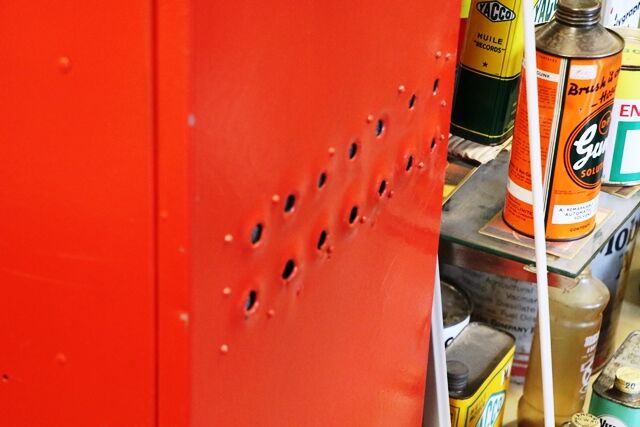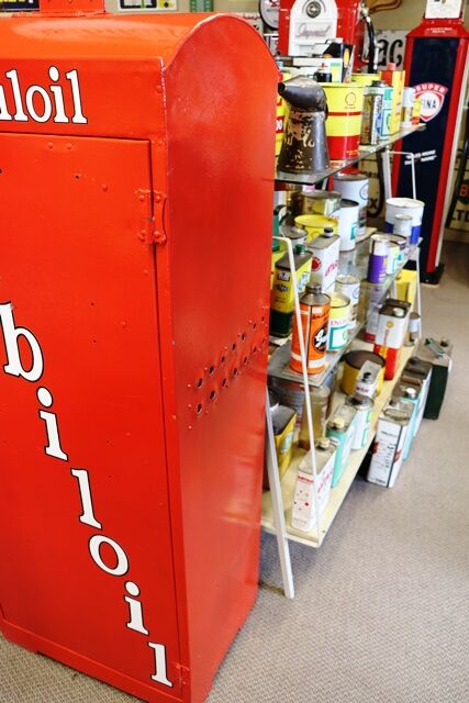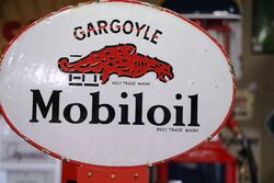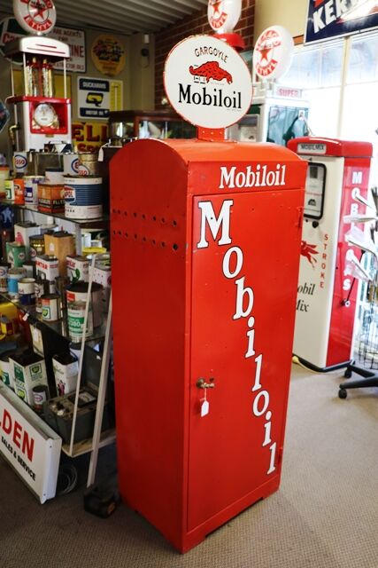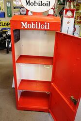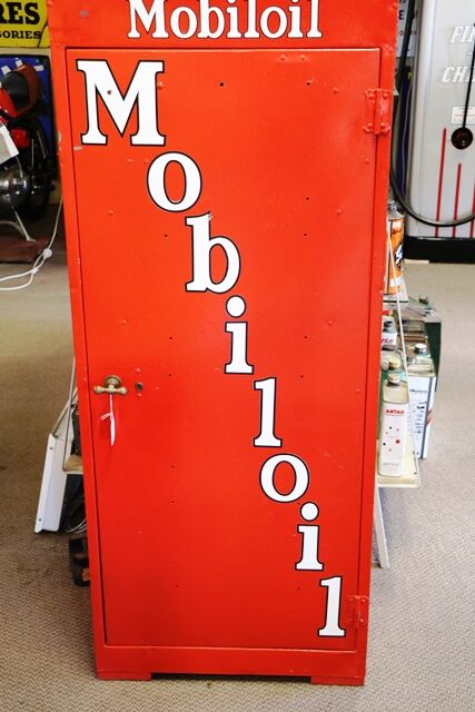 Vintage Dome Top Mobiloil Single Door Oil Cabinet with Genuine Original Oval Double Sided Gargoyle Enamel Top Sign. RARE EXAMPLE.