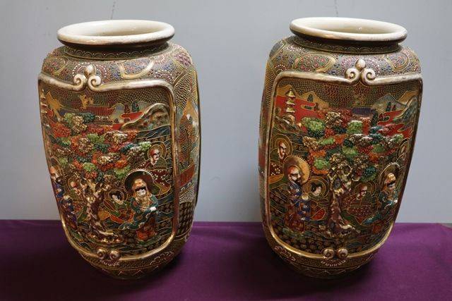 Large & Substantial Pair of Decorative Satsuma Embossed Vases. C1900 28cm wide x 48cm high