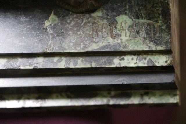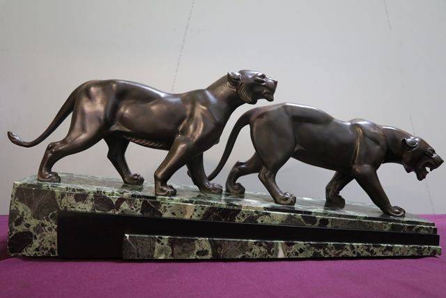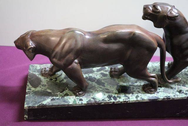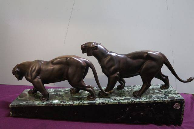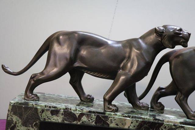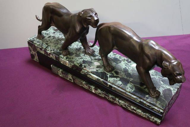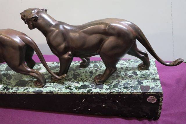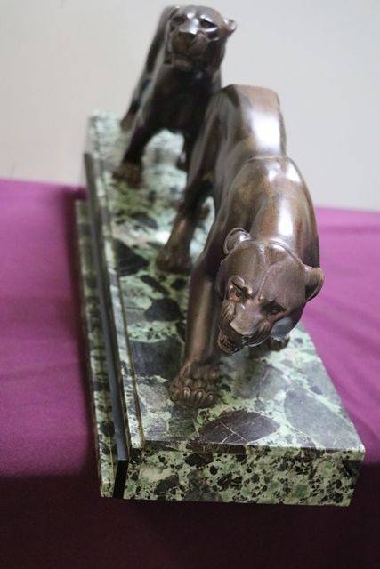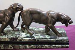 Stunning Signed Pair of Art Deco Spelter Panthers By Rochard in Green Marble base.