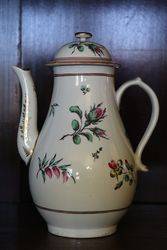 Worcester Coffee Pot + Cover Painted with Sprays of Pink + Yellow Flowers,, The Spout + Handle With Gilt Foliage C1780. Stunning early example. Faint Crack to Cover
