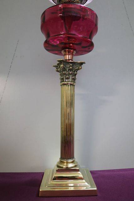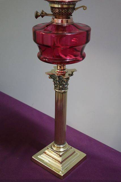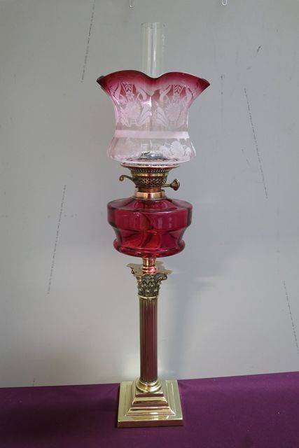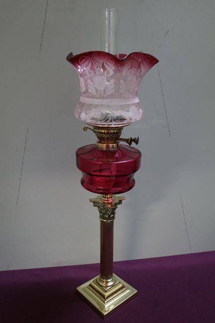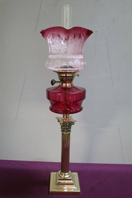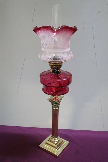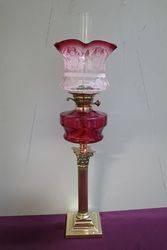 Stunning & Original All Ruby Glass Victorian Banquet Lamp on Brass Corinthian Column with Brass Double Burner. Wonderful Example.