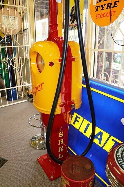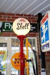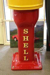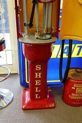 Well Restored Gilbert & Barker T8 Manual Petrol Pump in Shell Livery. This is the rare model with clock face dial incorporated in the Cast Door, Comes with glass illuminated Shell Pill Globe. CIRCA 1920..