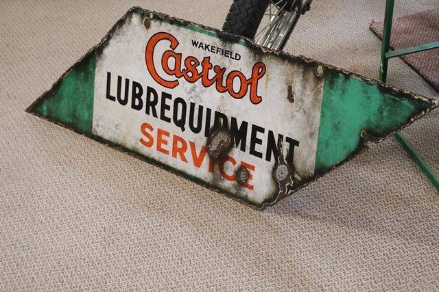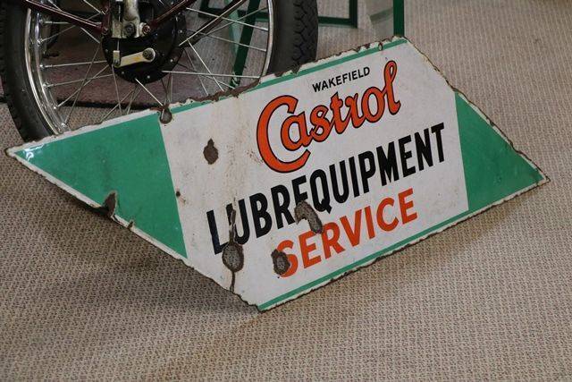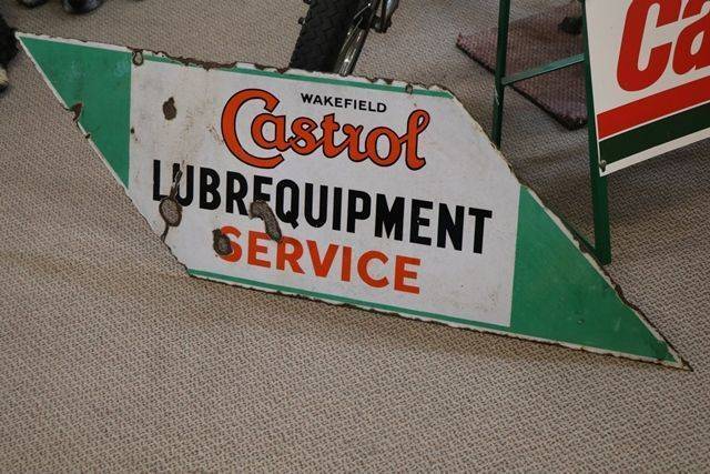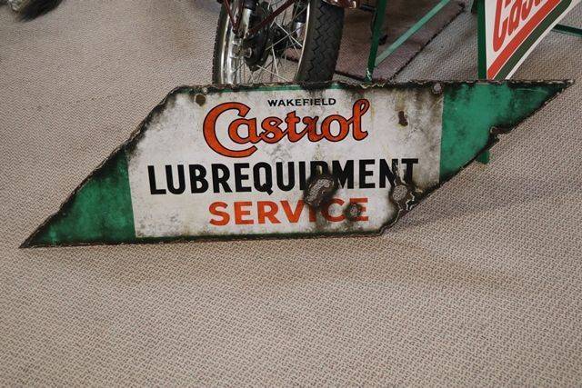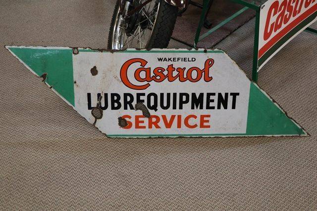 A Rarer Wakefield Castrol Lubrequipment Double Sided Lightning Shaped Enamel Sign. Not the best one we have ever had but still displays well and is priced accordingly.