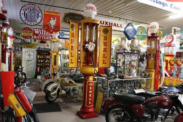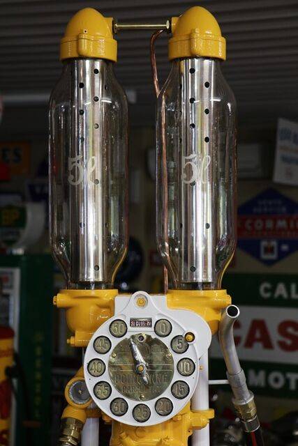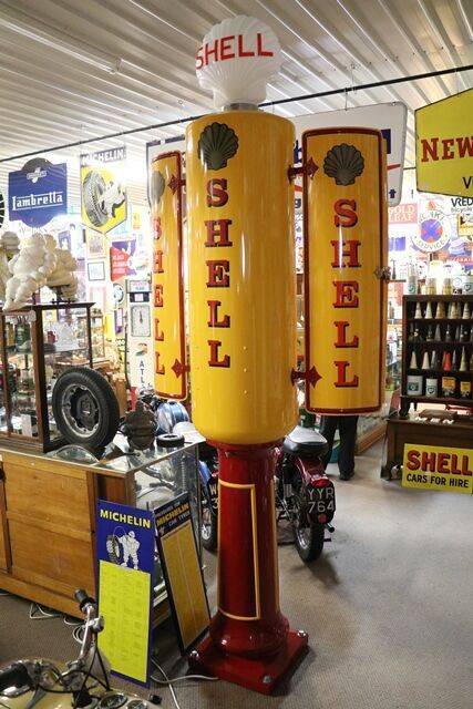 Stunning Satam-Carbox Twin Cylinder 2 Door Cabinet Top Manual Petrol Pump Restored in Shell Livery with a Illuminated Shell Glass Globe.