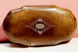 A Superb 19th Century French Oval Horn Silver Inlaid Case Sewing Kit Complete with Gilt Metal Thimble, Picker, Needle-case, Pair of Scissors all on a Coral Velvet Ground. 12cm wide..