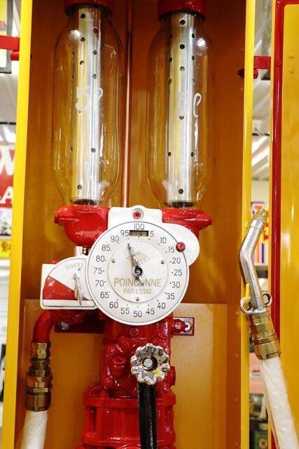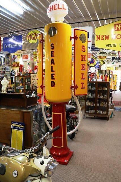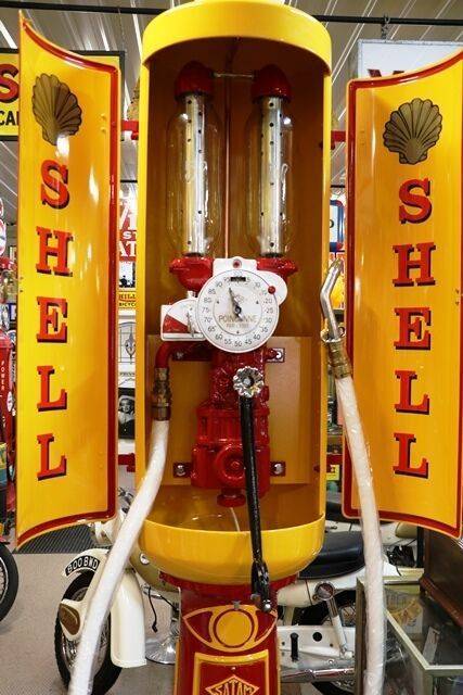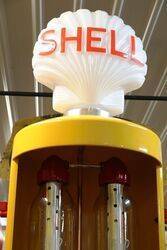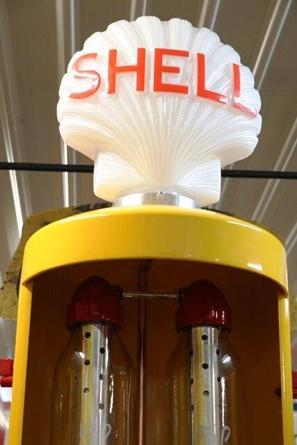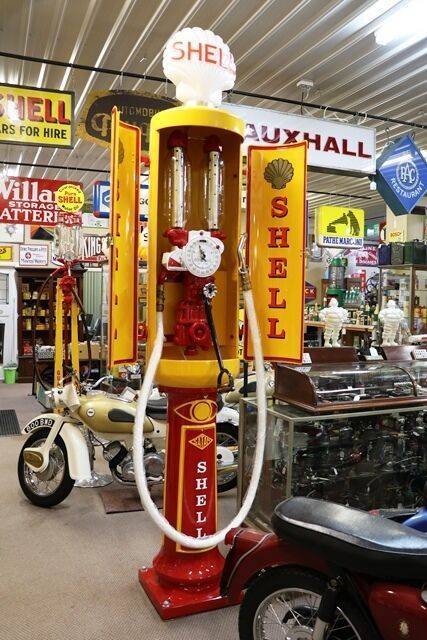 Stunning Satam-Carbox Twin Cylinder 2 Door Cabinet Top Manual Petrol Pump Restored in Shell Livery with a Illuminated Shell Glass Globe.