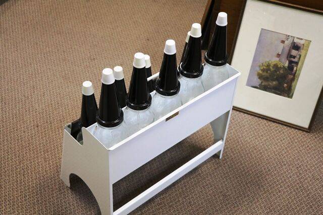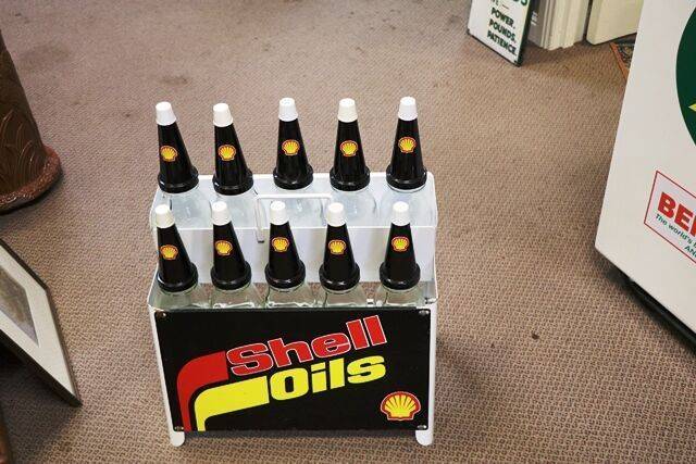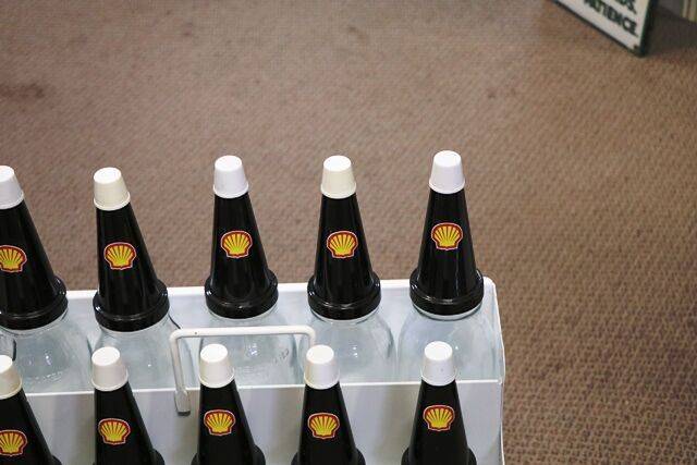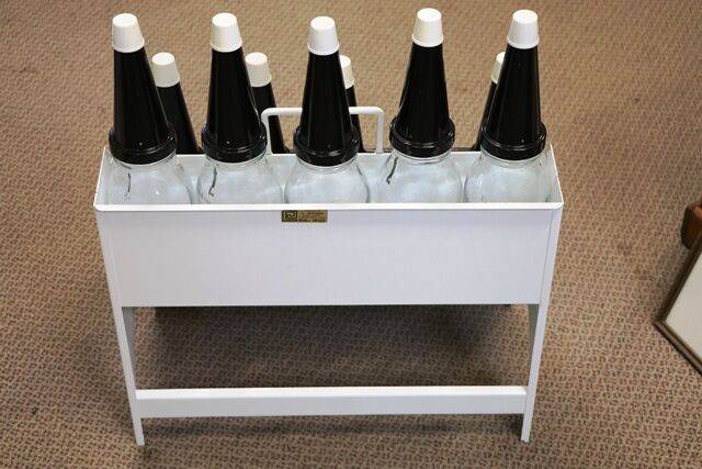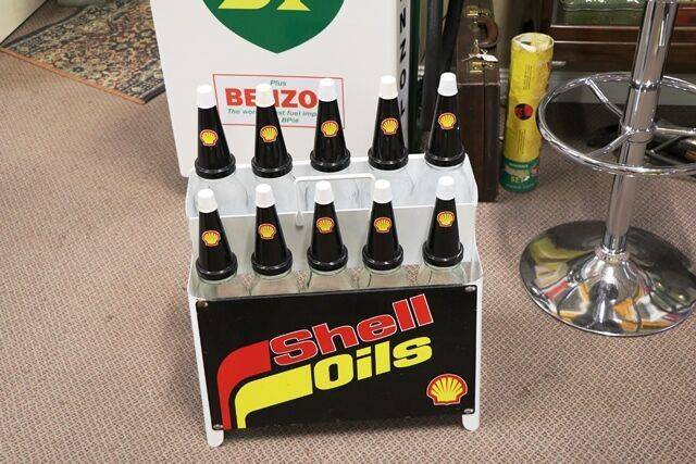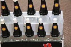 New Old Stock Shell 10 Bottle Forecourt Rack. 6 one litre bottles & six 500ml bottles.. with 12 plastic tops & dust caps.