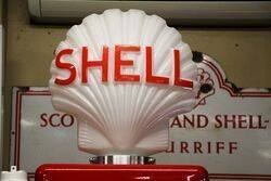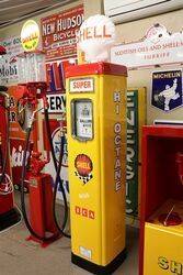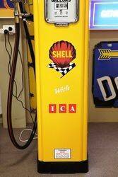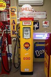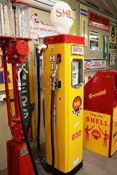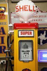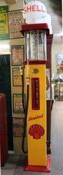 Gilbert & Barker 6 Gallon Glass Cylinder Manual Petrol Pump in Shell Livery with Glass Shell Clam Globe. 46cm wide x 283cm high x 46cm deep