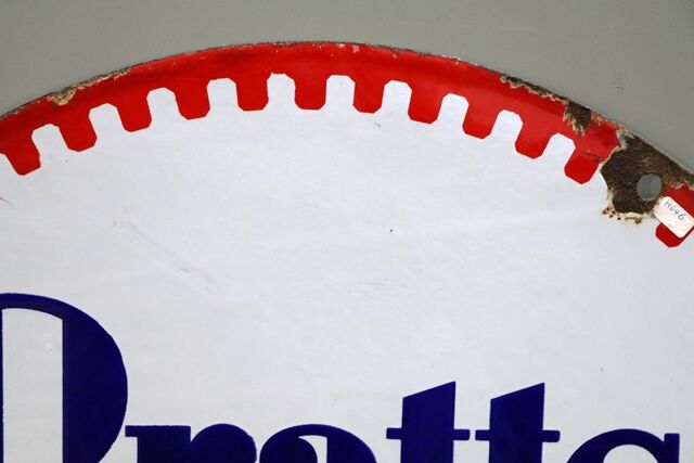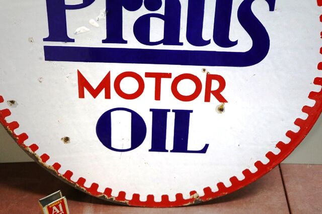 Vintage Pratts Motor Oil Double Sided Enamel Advertising Sign. By Bruton, Palmers Green, dated Dec 1929. Good colour and gloss. 53cm dia.
