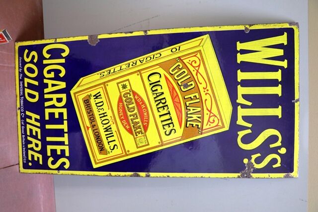 Antique WILL's Tobacco & Cigarettes Strip Enamel Sign. Three Castles---Gold Flake----Capstan Navy Cut.. Good Colour and Gloss.. 51cm wide x 205cm high.