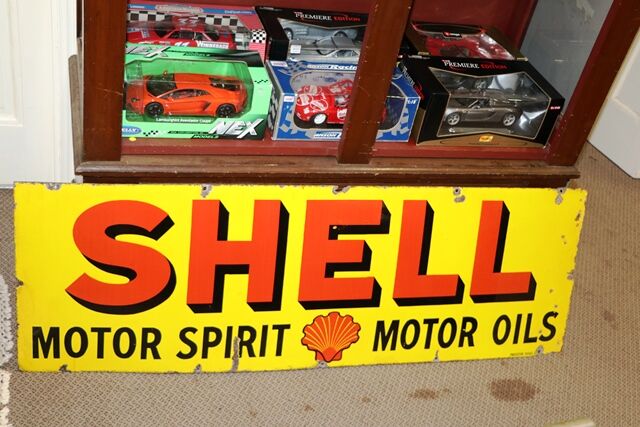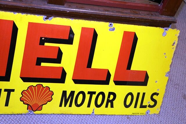 Vintage Shell Motor Spirit - Motor Oil Enamel Sign. Very Good Colour & Gloss. 137cm wide x 46cm high. By Protector Eccles.