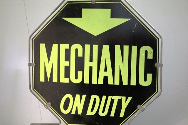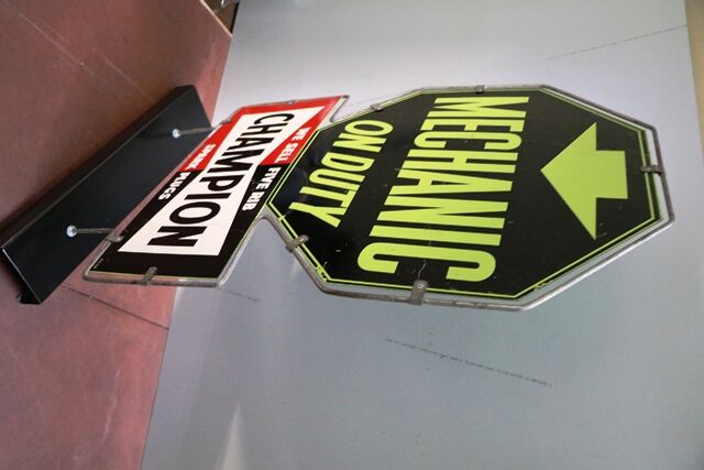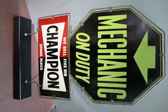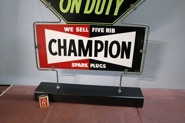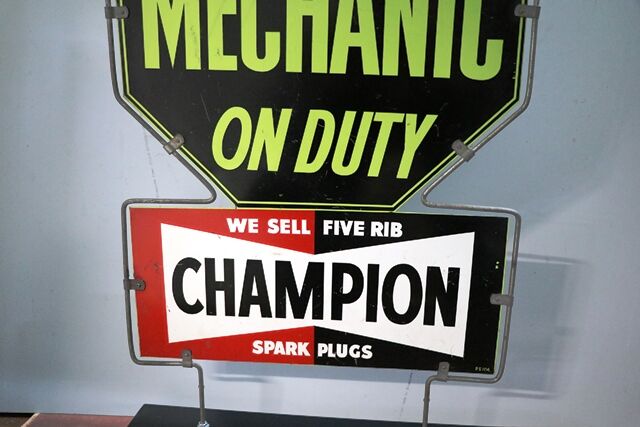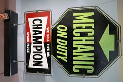 Vintage Champion Mechanic on Duty Double Standing Tin Sign. #