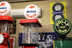 A Superb Restored Vintage Gilbert & Barker Manual Petrol Pump in Mobilgas Livery. Glass 6gal Cylinder & Glass Advertising Globe.