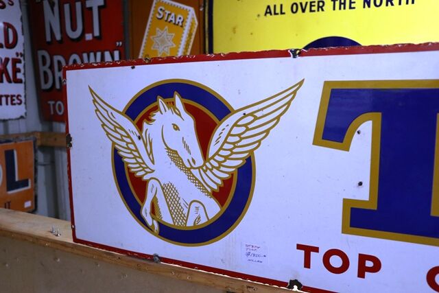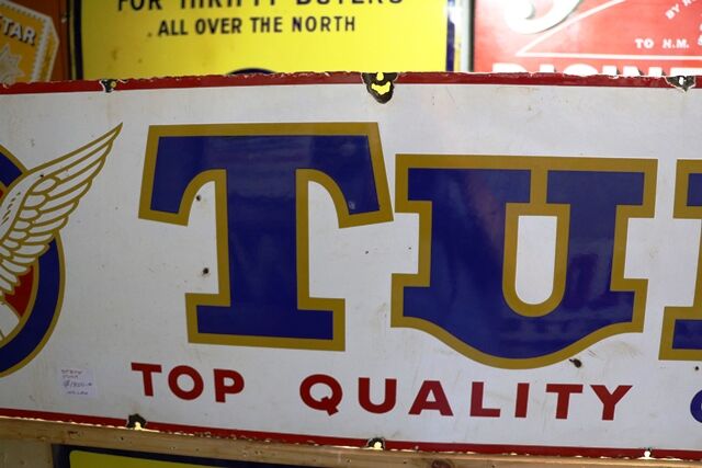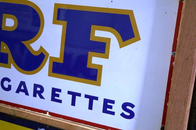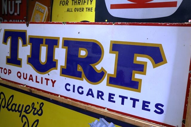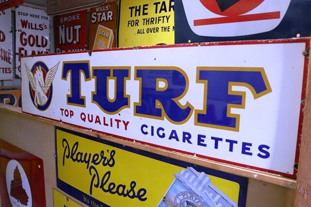 Vintage Greys is Great 2 Piece Enamel Cigarettes Advertising Sign. 152cm each wide x 23cm each high. total 305cm wide x 23cm high.