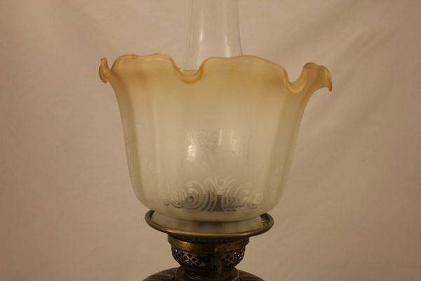 Victorian Table Oil Lamp W/ Original Shade + Font And Brass Column C1900 measures 71cm tall