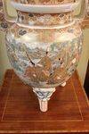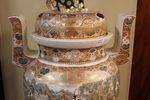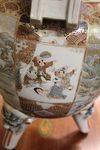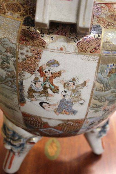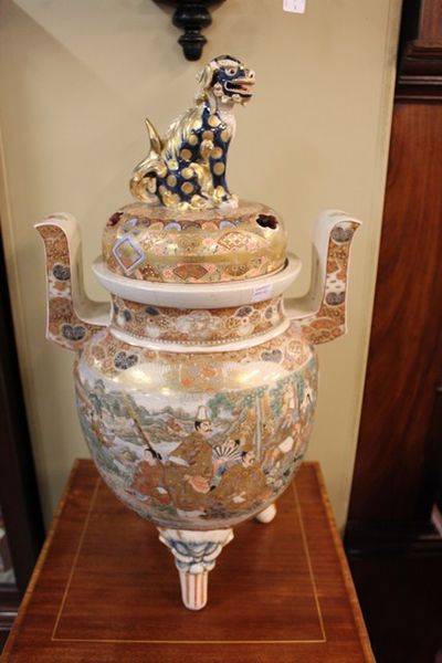 Japanese Satsuma Large Lidded Vase decorated with panels all round. The lid is surmounted by a Fo dog. Signed Satsuma Koro by Hattori measures, has some minor hairline cracks 64cm x 34cm