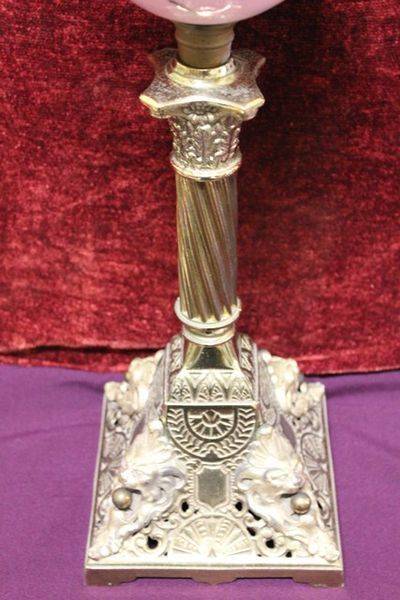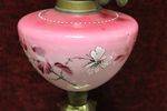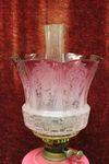 Stunning Victorian Double Burner Banquet Oil Lamp. Wonderful Brass Column Base, Pink Satin Glass Font with a Quality C20th Etched Glass Shade. 90cm tall